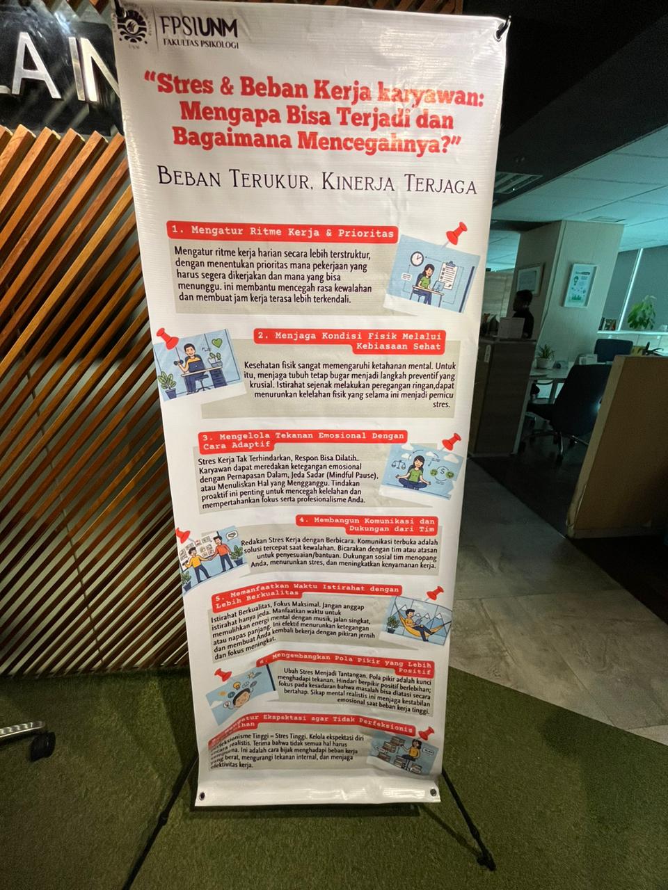 Stand Banner Psikoedukasi guna mencegah stres dan beban kerja Sumber: Dok. Pribadi Mahasiswa Magang Bentuk Kegiatan Pembelajaran (BKP) Merdeka Belajar Kampus Merdeka (MBKM) Fakultas Psikologi (FPsi) Universitas Negeri Makassar (UNM)