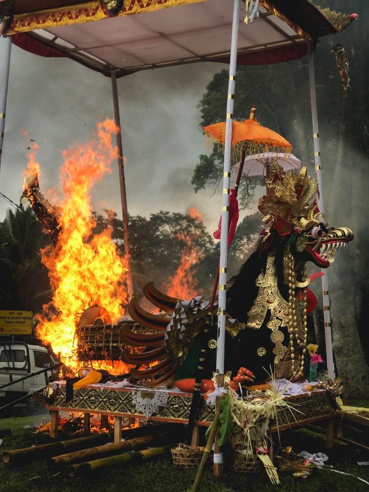Ilustrasi "Ngaben sebagai Identitas Budaya dan Mekanisme Psikologis Kolektif" Sumber: Pinterest Tradisi Ngaben dalam masyarakat Hindu Bali merupakan salah satu bentuk ritual penghormatan kematian yang paling kompleks dan bermakna. Upacara