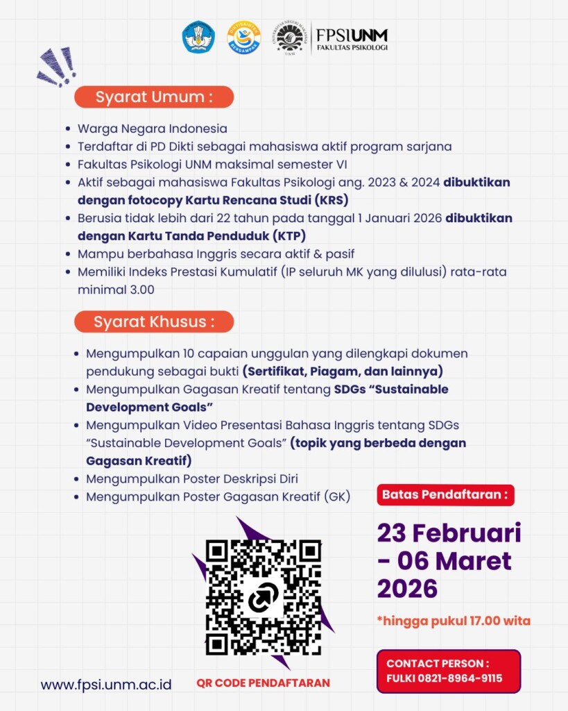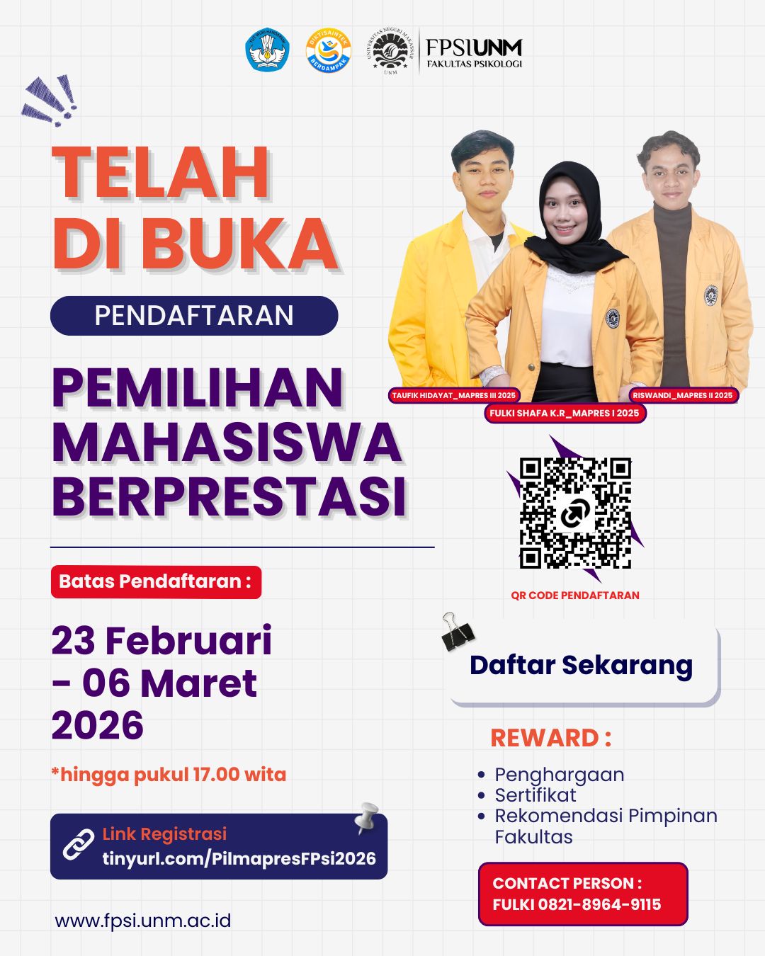 Psikogenesis, Rabu (25/02) — Fakultas Psikologi (FPsi) Universitas Negeri Makassar (UNM) telah membuka pendaftaran Pemilihan Mahasiswa Berprestasi (Pilmapres) FPsi UNM 2026 mulai dari Senin (23/02) hingga Jumat (06/03).
