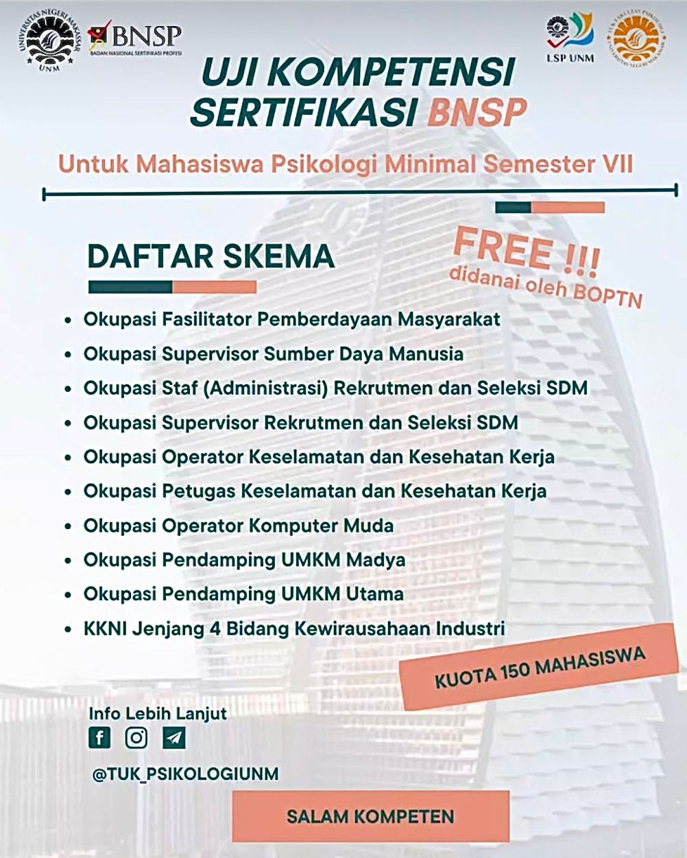 “Sertifikasi BNSP memberikan standar yang seragam di seluruh Indonesia. Dengan mengantongi sertifikat berlogo burung Garuda, kompetensi mahasiswa diakui negara sesuai dengan skema yang diambil, sehingga kualitasnya dianggap sama baik di Makassar maupun di Jakarta,” terangnya.