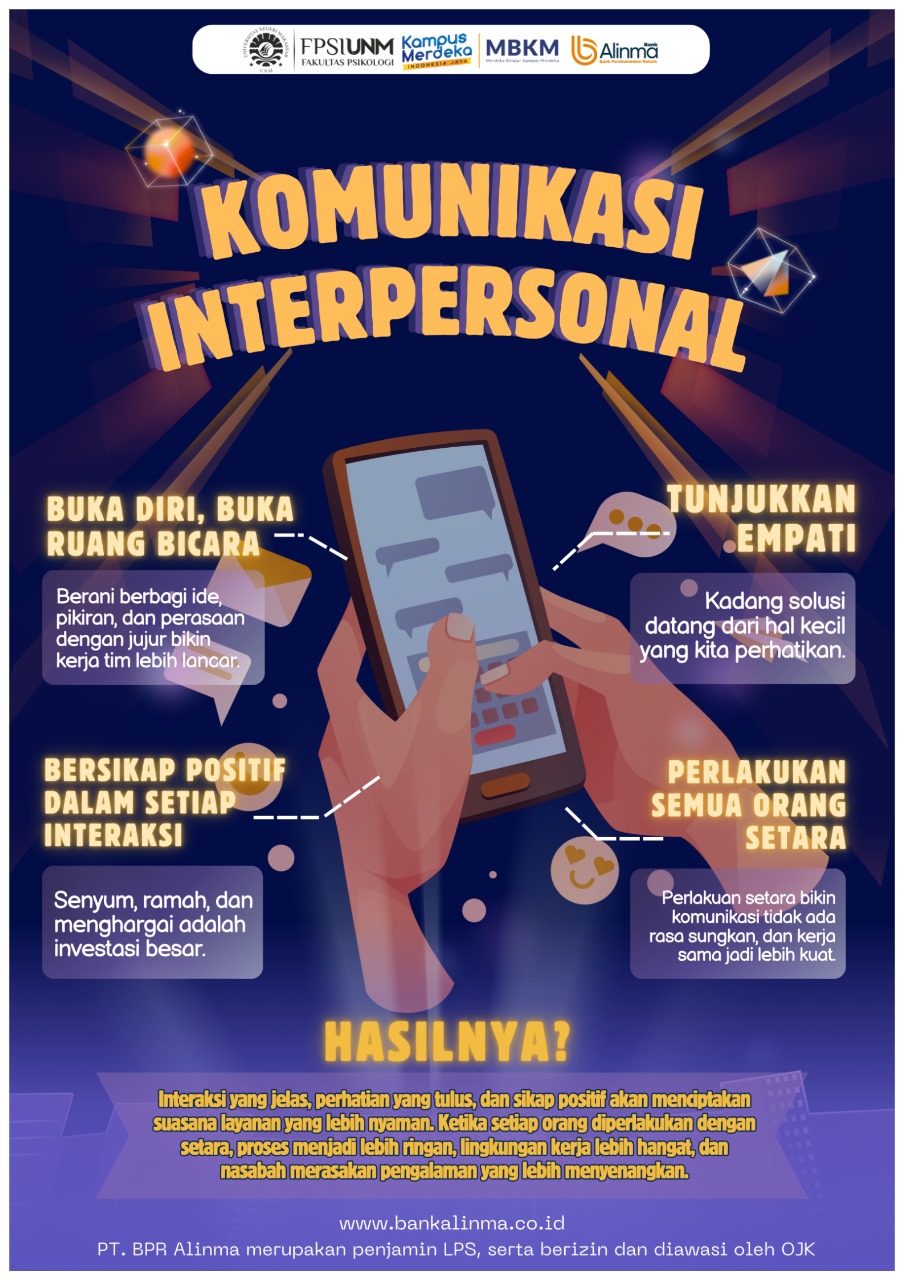 Dalam upaya untuk meningkatkan kualitas komunikasi antar karyawan di Bank Alinma Makassar, kelompok magang yang terlibat dalam program ini meluncurkan sebuah poster edukasi bertema “Meningkatkan Komunikasi Interpersonal dalam Menghadapi Tantangan Kerja Karyawan Berdasarkan Prinsip Komunikasi Interpersonal”. Poster ini dirancang untuk membantu karyawan memahami pentingnya komunikasi yang efektif dalam menghadapi tantangan kerja sehari-hari di lingkungan perbankan.