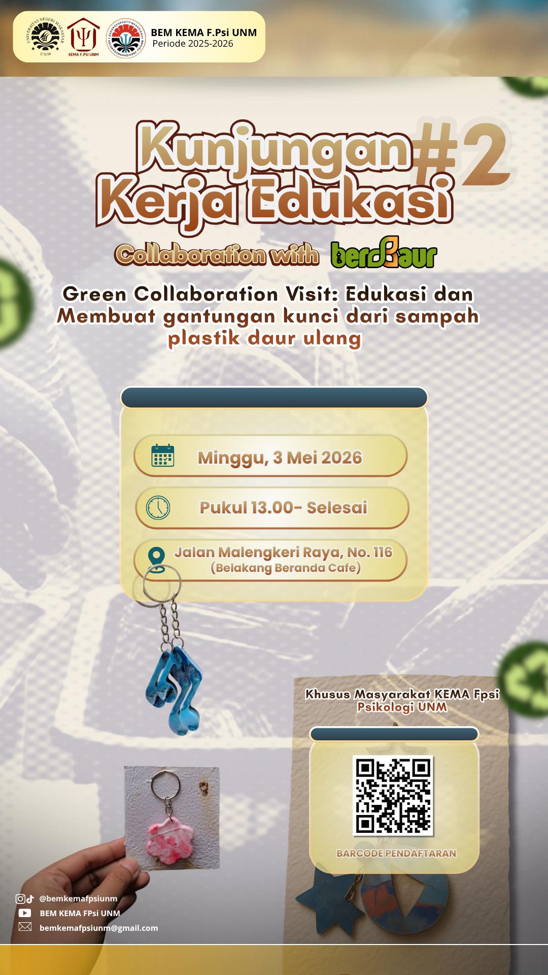 Psikogenesis, Kamis (30/04) – Kementerian Pengabdian Masyarakat (Kemenpema) Badan Eksekutif Mahasiswa (BEM) Keluarga Mahasiswa (Kema) Fakultas Psikologi (FPsi) Universitas Negeri Makassar (UNM) akan melaksanakan kunjungan kerja edukasi bersama Berdaur.id di Workshop Berdaur.id pada Minggu (03/05) mendatang.