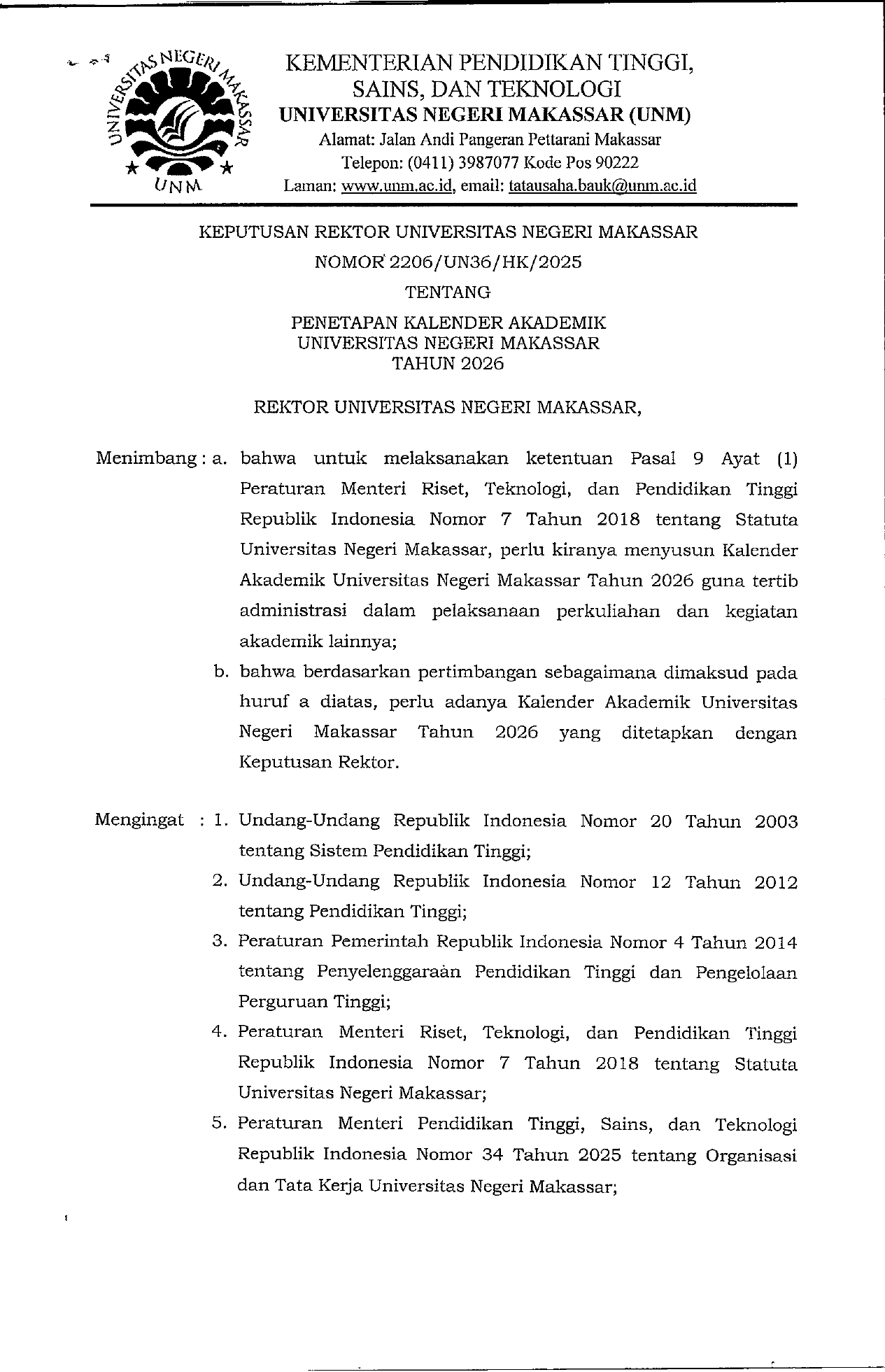 KEPUTUSAN REKTOR UNIVERSITAS NEGERI MAKASSAR TENTANG PΕΝΕΤΑΡΑΝ KALENDER AKADEMIK UNIVERSITAS NEGERI MAKASSAR TAHUN 2026